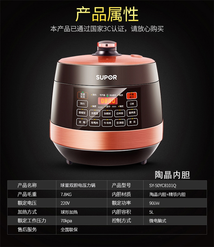 苏泊尔 SY-50YC8101Q 2017新款 电压力锅 球釜双胆 触摸屏 5L 618狂欢价包邮 279元