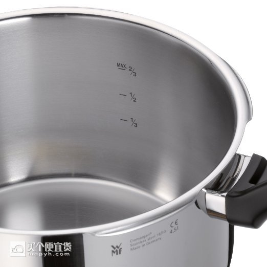 这款压力锅属于WMF的PERFECT系列,整锅德国原产,锅身是WMF独家的Cromargan材质,在不锈钢中加入18%铬+10%镍,更加防锈且耐腐蚀。TransTherm三层合金锅底,在两层不锈钢中以三明治夹心防锈加入纯铝以增加锅体的导热速度,相对一般压力锅具备更长的保温时间,而且可用于多种类型的灶,说是压力锅,但实际上蒸焖炖汤均可。锅体锅盖均可使用洗碗机清洁。