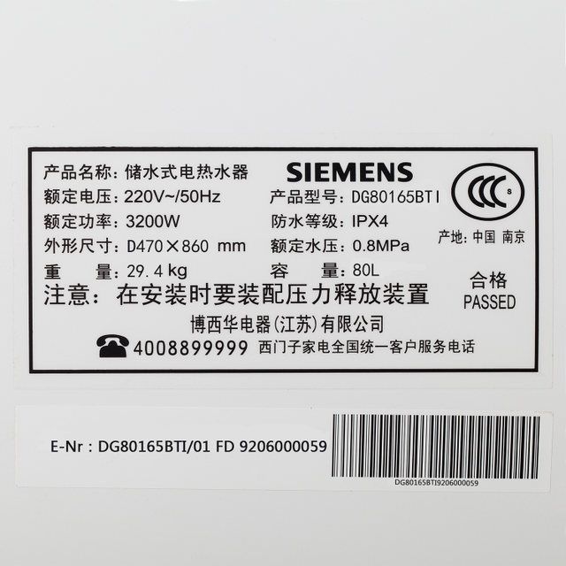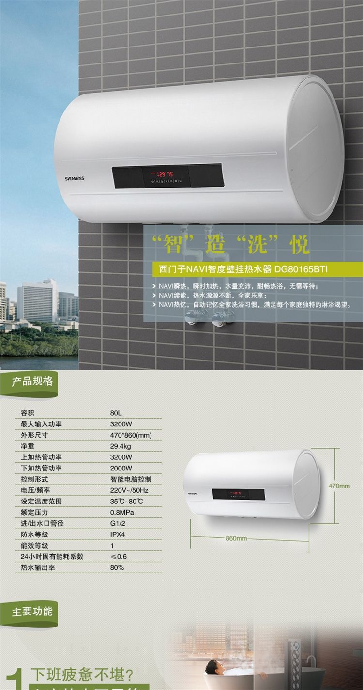 西门子 DG80165BTI 储水式 电热水器 80L 有瞬热功能 可遥控 3200W 一级能 1999元