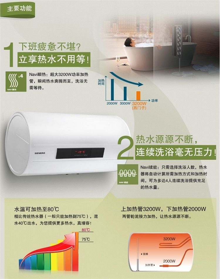 一般的电热水器是40、50、60L,这款是80L的大容量,4-5口使用完全没问题,可同时满足浴室洗浴,厨房用水,日常洗漱;