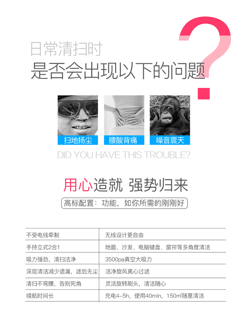 天猫地贝苏州专卖店699元,下单立减100元,再叠加300元券,实付299元包邮,同款京东649元,差价巨大。这款吸尘器,手持式、立式二合一,使用方便,既可以用来打扫地面,也可以清扫汽车、柜子、床铺等,各种角落轻松清洁,配备多种刷头,全方位多样吸尘。采用高效变频电机,高达3500帕真空吸力,比其他无线吸尘器更能吸。大容量锂电池,可持续使用40min。