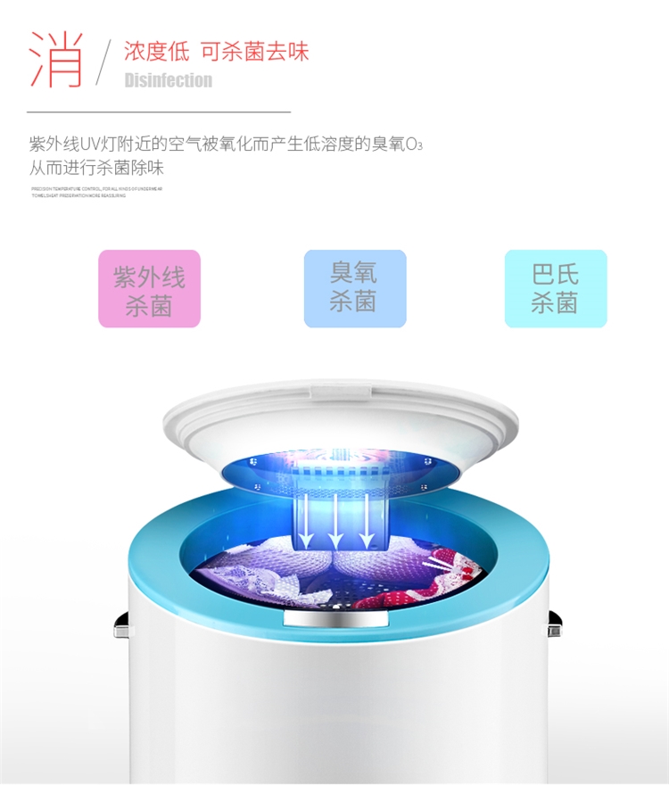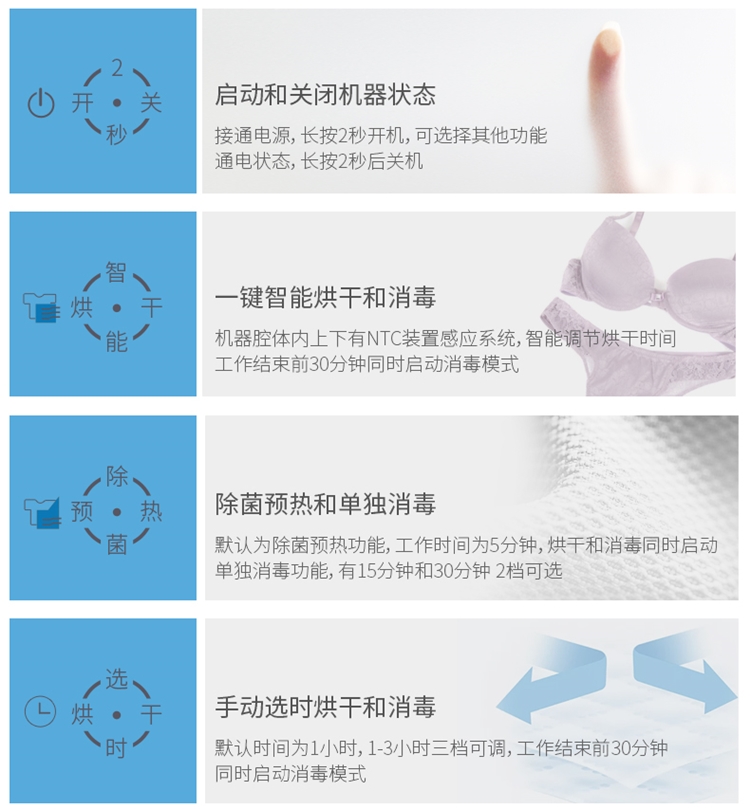除了可以消毒内衣裤,还可消毒婴儿餐具和玩偶玩具;默认除菌+预热是5分钟(手动调节15分钟和30分钟可选),衣干即停;顶部的出风口需保持畅通,因为会有热气和异味排出;按钮一键开盖,上盖打开后,安全童锁自动开启,防止误碰电源开关。