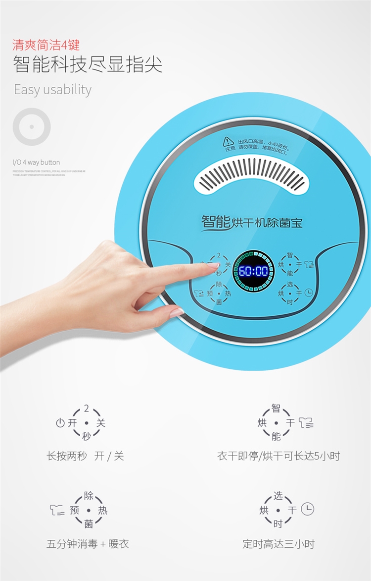 内胆是304不锈钢,加热快,结实耐用,易清洁,无高锰;一键烘干和消毒,腔体内上下均有NTC感应系统,智能调节烘干时间(最长5小时),工作结束前30分钟,自动启动消毒模式,默认是1小时,1~3小时三挡可调,手动选时。