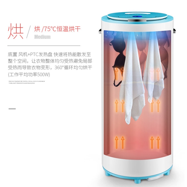 烘干:底置,风机+PTC发热盘,能快速将热能散发至整个空间,让衣服整体均匀受热,避免局部受热而导致衣服变形,360°循环均匀烘干。