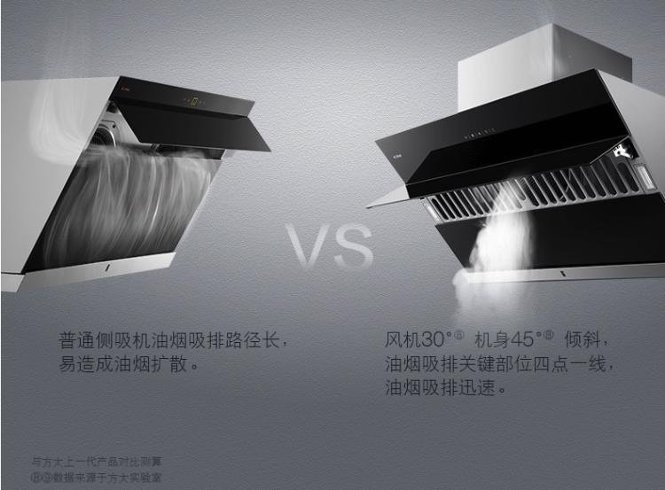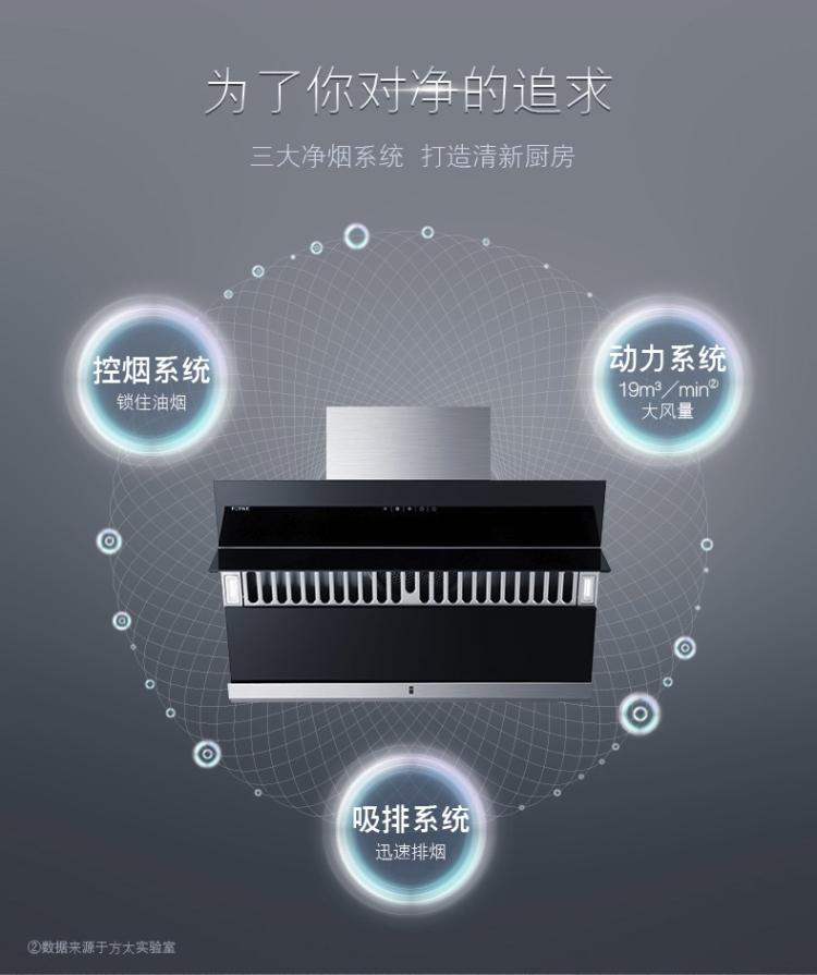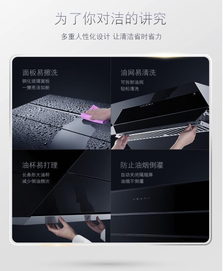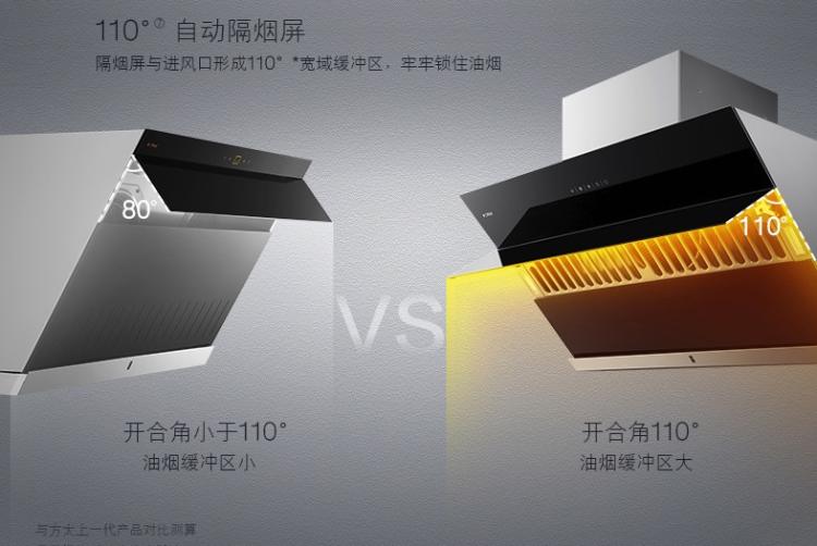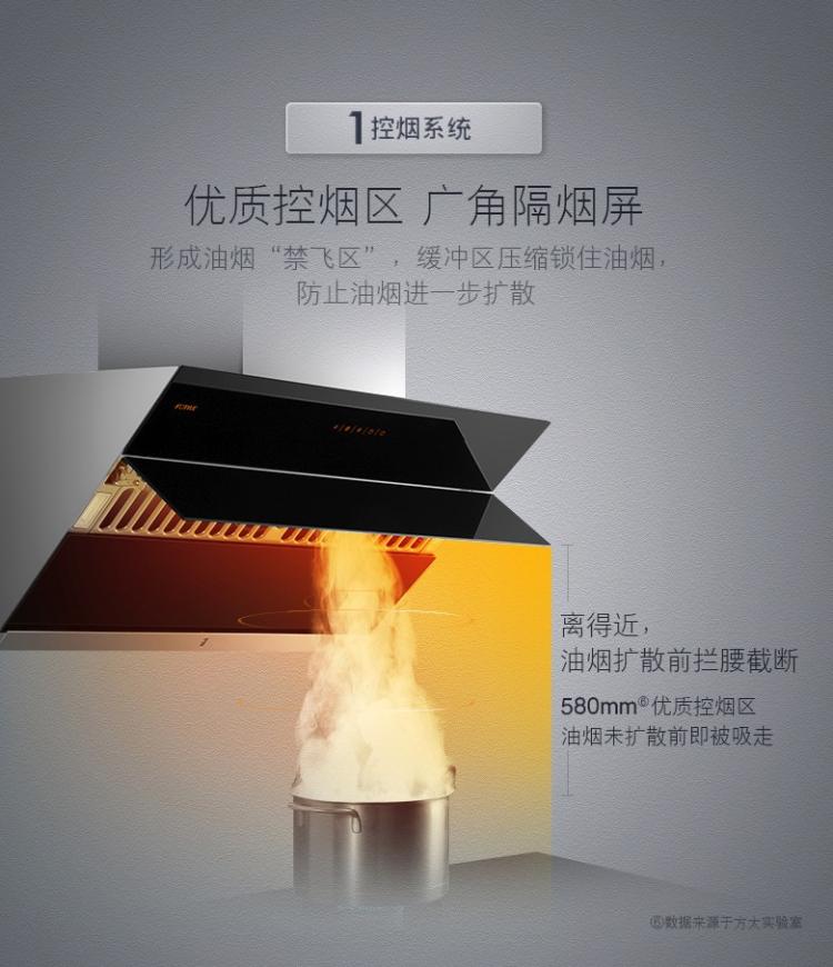 2.配有全自动隔烟屏,采用宽13cm的玻璃材质,在0-110°之间自动调节,可以有效阻挡油烟从顶部扩散。油烟机关闭时,隔烟屏闭合,屏蔽油烟倒灌串味。