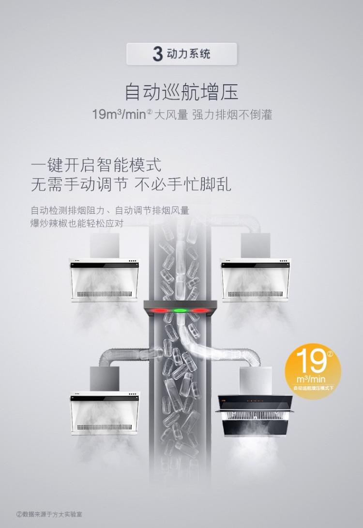 3.自动巡航增压,当排烟环境不畅、阻力变大时,油烟机就会自动增速加压,最大静压可达350Pa。