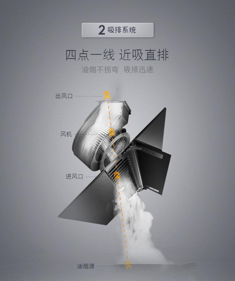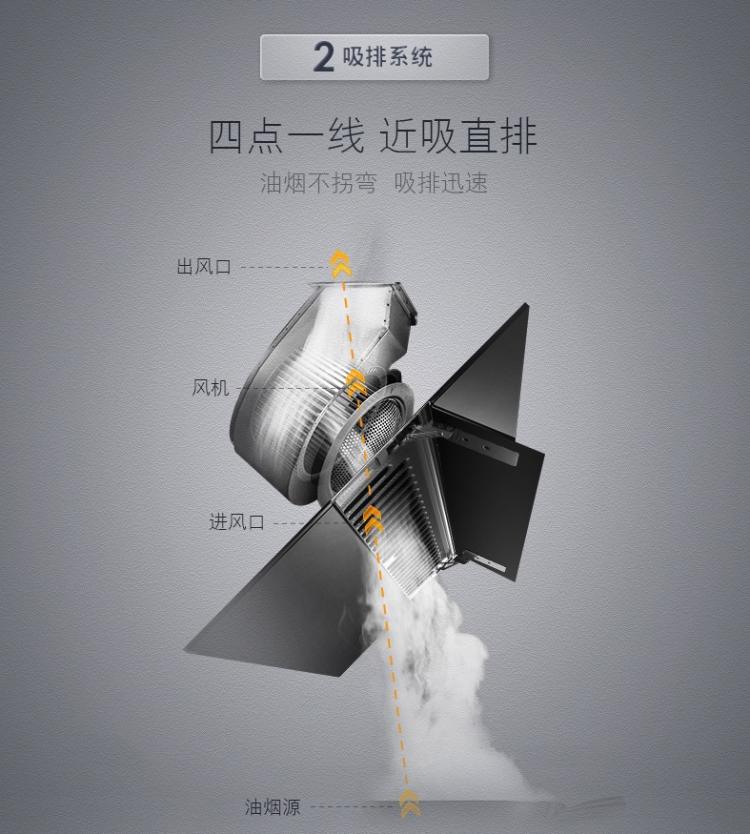1.敞篷宽流进风,80CM宽流进风口,设置在距离灶具面板580mm附近高度,吸力均匀覆盖,没有死角,抓烟力强。