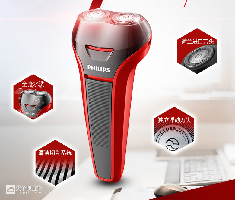PHILIPS飞利浦充电式电动剃须刀S108采用荷兰进口独立浮动刀头,清洁切剃系统,防水机身设计,水下可直接冲洗清洁,清洁更全面,预防细菌螨虫滋生。