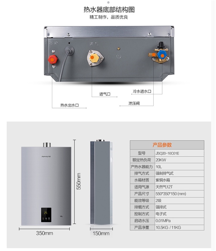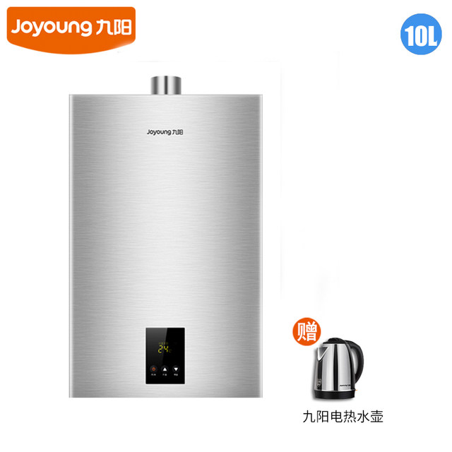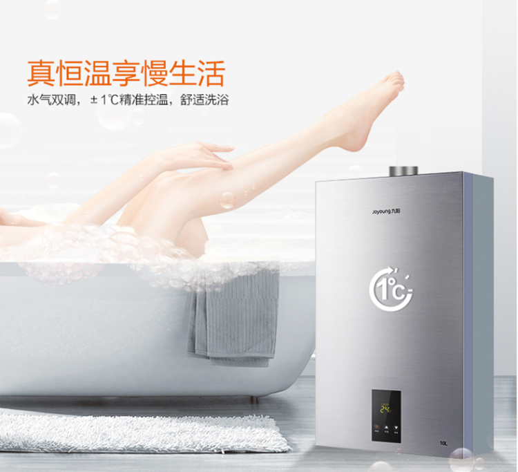 这款九阳 JSQ20-10C01E 燃气热水器,使用天然气,水气双调,±1℃控温,双阀恒温,断电记忆,八年质保,全国免费安装,容量是10L。燃气比例阀,根据电脑板指令,控制燃气和空气的混合比例,达到充分燃烧;水量伺服器,自动调节出水量,使用方便;