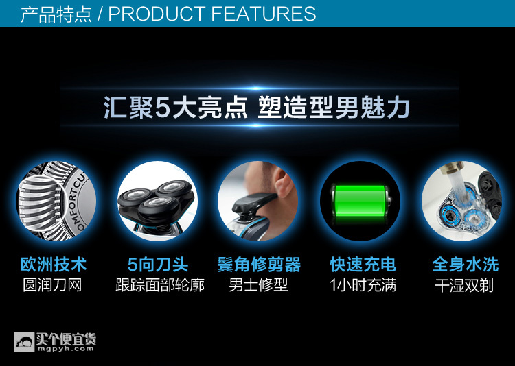 PHILIPS 飞利浦S5070/04电动剃须刀,ComfortCut刀片系统,顺畅剃须保护皮肤,5向Flex剃须刀头,1小时快速充电,舒适智能贴面剃须,手柄设计符合人体工程学。一把须刀满足多种需求,强劲的持续动力,1900+转/分钟,5个独立动作,贴合面部轮廓,对于颈部和下巴等难剃到的部位,也可胜任。全身水洗设计,一键打开,30秒清洁。