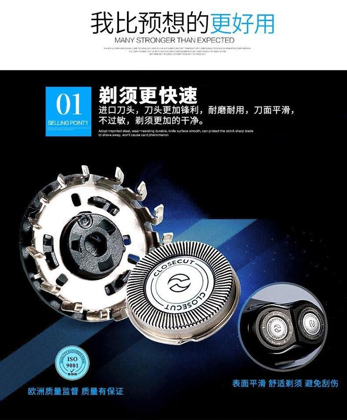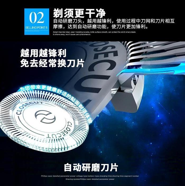 Philips飞利浦S301剃须刀采用欧洲进口刀头,同样也有舒适的切割剃须系统,以及弹性贴面系统,不卡须更耐磨,微调浮动,剃须体验更棒。外观差不多,都是半透明前盖、高光铬环,只是手柄颜色不同,更有质感些。其他参数方面,原厂两年保修,充电时间比较长,充电10小时可用25分钟左右,可水洗、带充电指示灯。