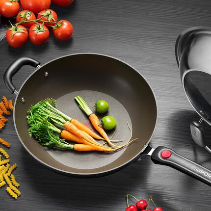 苏泊尔第二代红点火炒锅,采用铝合金打造,钛晶钢不粘材料,精密压制,一体成型,火红点设计,油温可见,更健康,直径32cm,易清洁,油烟再见。