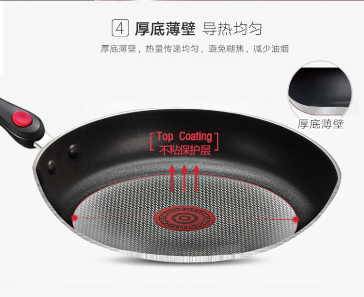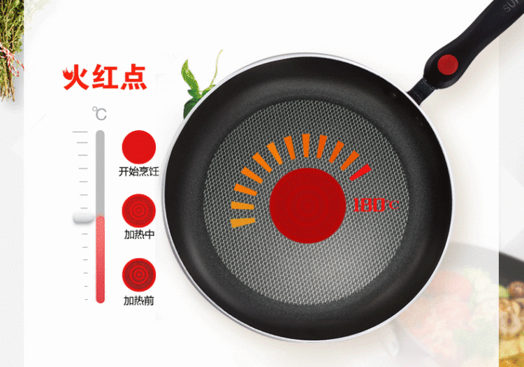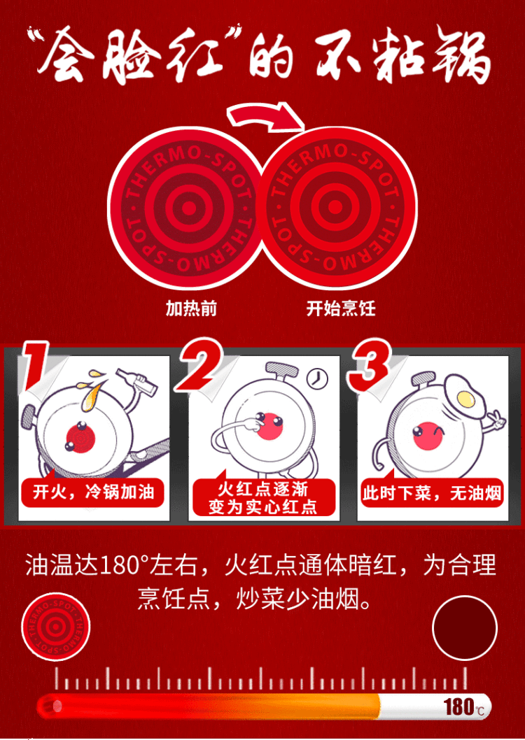 苏泊尔独家火红点技术,将温度变得可见,加热过程中,当火红点两种深浅不同的红变成一种红色时,表示温度达到最佳烹饪温度180℃左右,此时下菜,能有效避免油温过高而产生有害物质,从烹饪一开始就有效防止油烟产生,油温可见,油烟再见。