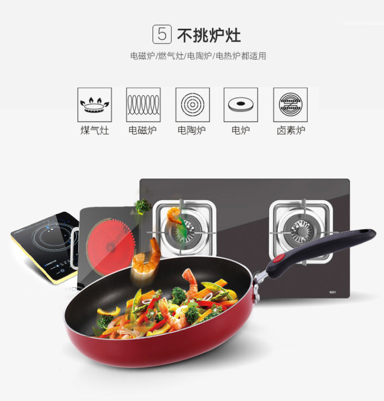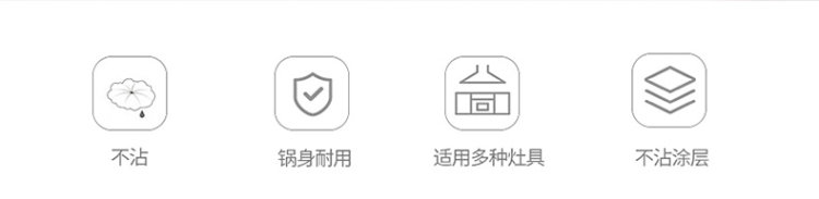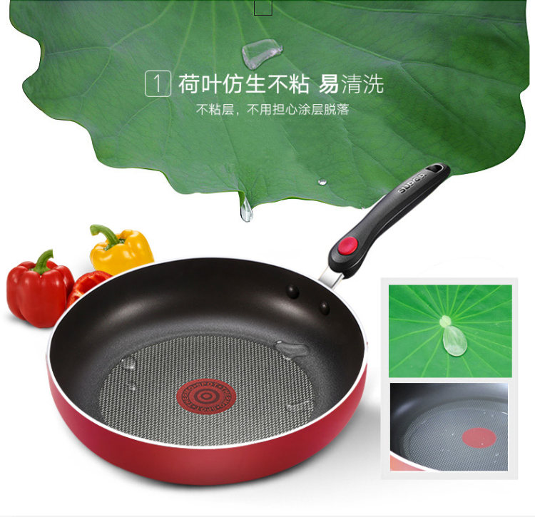 仿荷叶不粘涂层,优选美国杜邦材质不粘材质,环保、耐磨、无毒;搭配锅底的大面积的蜂巢凹槽,架空食物,防止粘连;复合锅底,聚热强,升温迅速,均匀吸热。