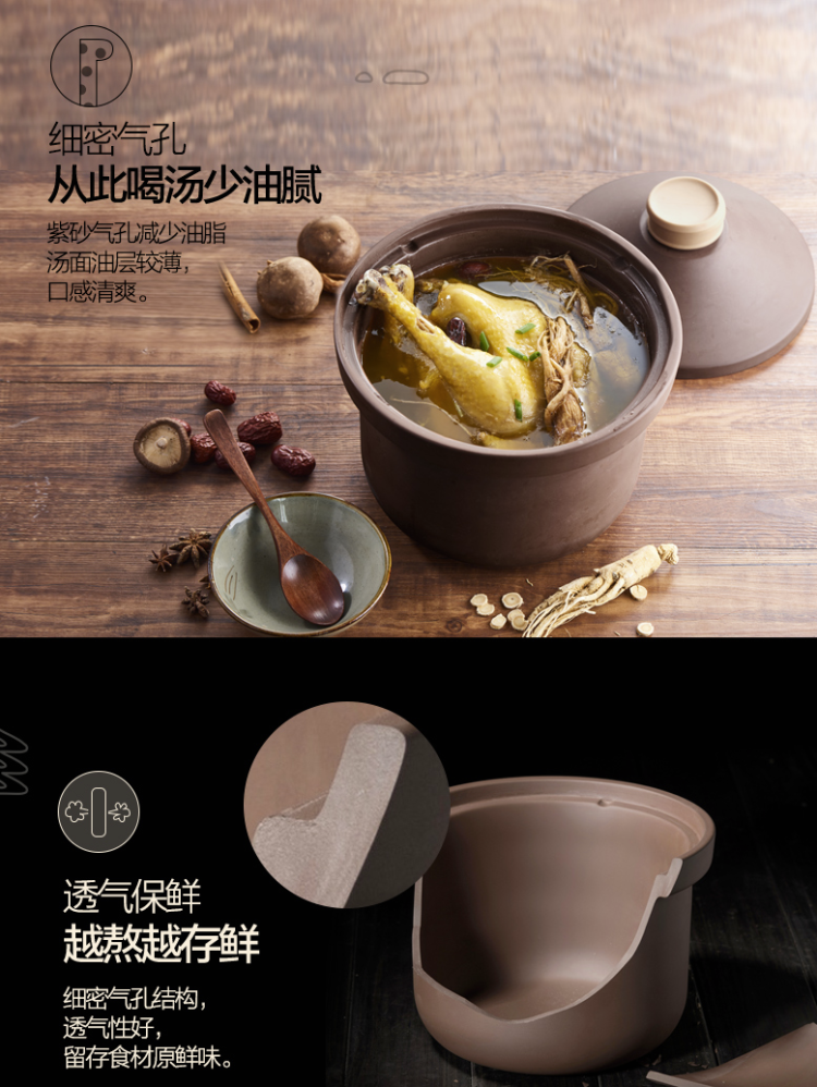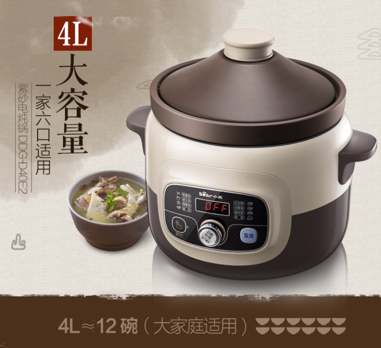 Bear小熊电器 紫砂电炖锅4L,天猫授权店铺售价¥298,可领100元现金券,券后¥198包邮,适合家庭使用,可煮粥、煲汤、炖汤。 在材质的选择上,内胆甄选原矿天然紫砂,使用传统手工工艺,经高温烧制而成,含有丰富的矿物质元素,不上色、不施釉,保留百万微细气孔,紫砂气孔减少了油脂使汤面油层较薄,保留了食材的原鲜味,汤香浓而不油腻,健康环保使用安全放心,也可称之为“会呼吸的紫砂胆”。 电炖锅内胆有加宽防溢凹槽设计,防止在烹制过程中汤水溢出锅外,熬煮既省心又省力。塔吉式锅盖,跟其内胆一样选用了原矿天然紫砂材质,锅内蒸汽易形成循环回流,保证汤的鲜味不流失;采用双层裹温、立体加热,四周环绕受热将食材彻底煮透,释放食材深层营养,恒定小火慢熬,食物营养不流失,充分渗透口感香浓,味道更加鲜美。 支持12小时预约+定时,待机状态下,煮好后自动进入保温状态,不用一大早没睡醒就起来做早餐,不用忙碌一整天回到家就急忙去厨房做饭,人性化的静音设计让你一晚无忧入眠,饭点时间随心控制,开盖就有饭,让煮粥炖汤都变得更轻松。