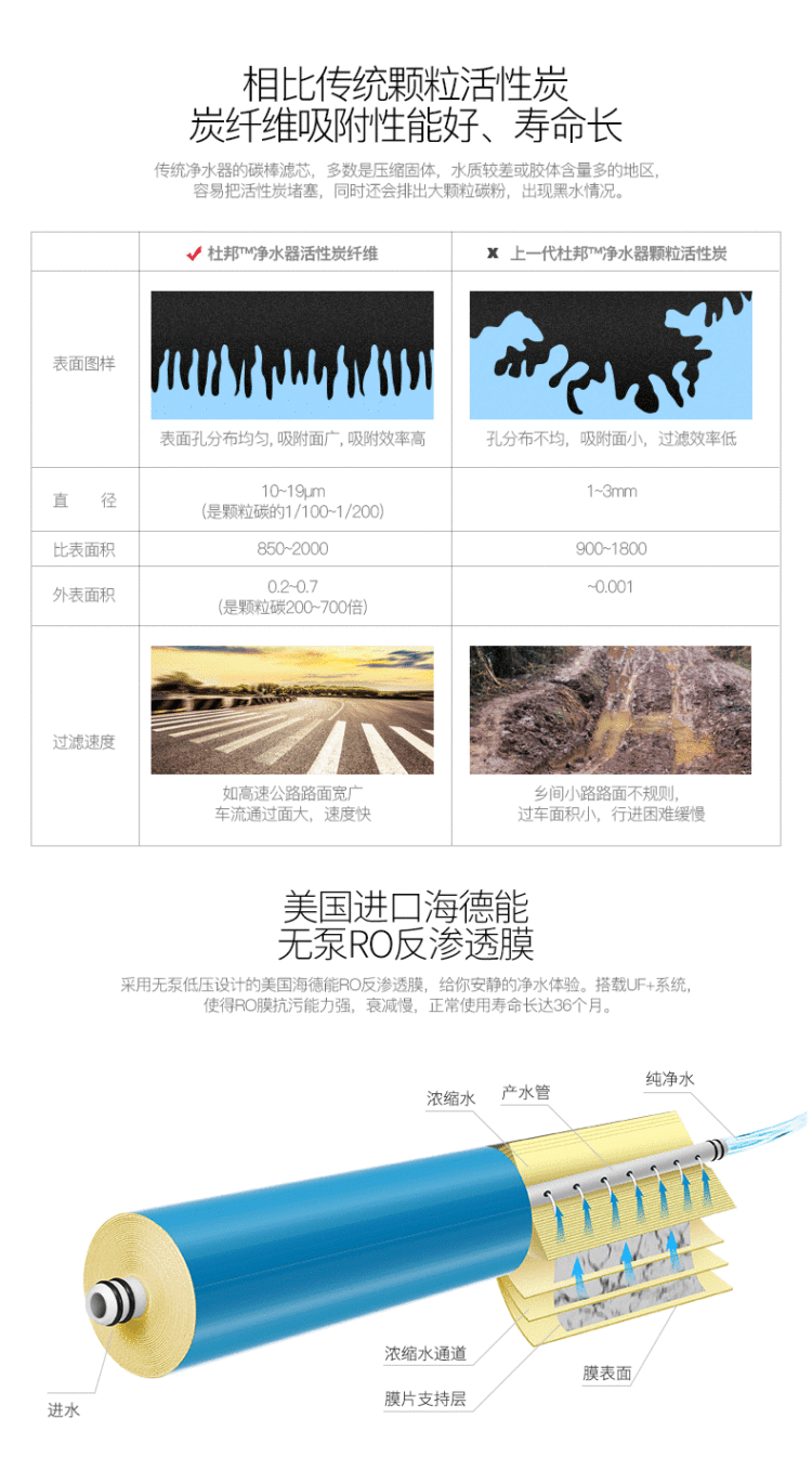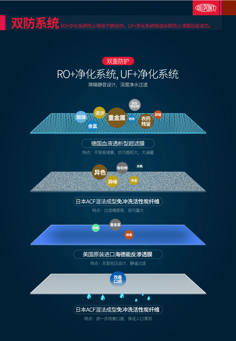 好的净水器都配备陶氏RO反渗膜,其实陶氏现在和杜邦是一家公司,自己出的净水器,自然用料、品质都是极好的。这款净水器集德国血液透析型超滤膜、美国陶氏膜、日本活性炭于一身,是本 站推荐过的最高端的净水器。
