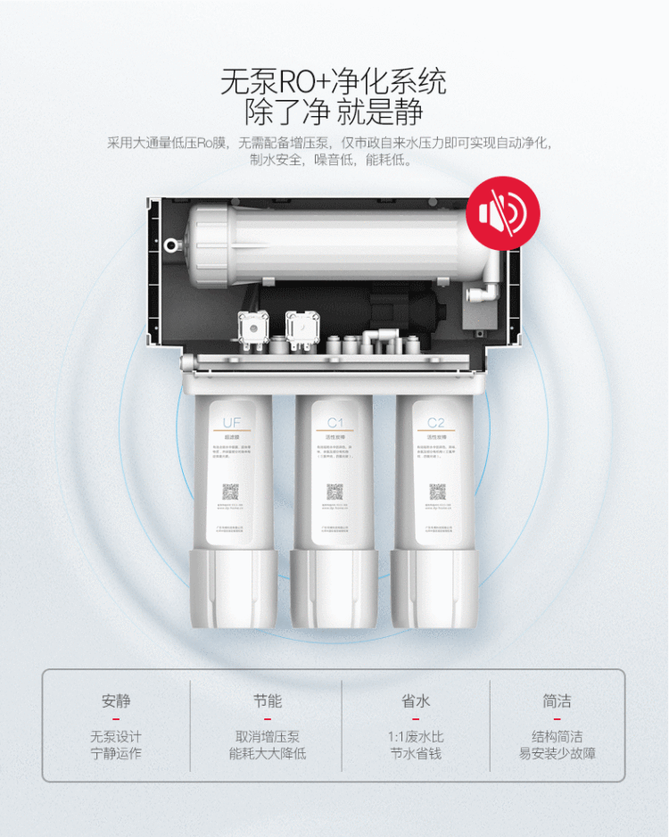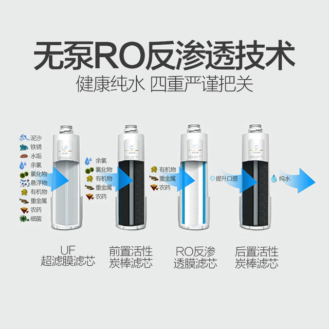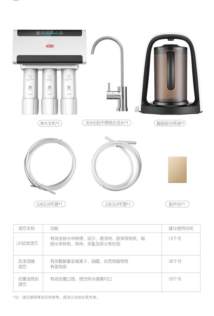 可见反渗透净水器的净水能力是最强大的,当然价格也是最贵的。这款净水器属于超滤+RO反射膜过滤,辅以活性炭,出水可直接饮用,是最高级别的家用净水器了。