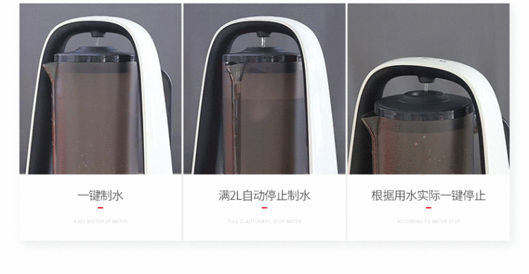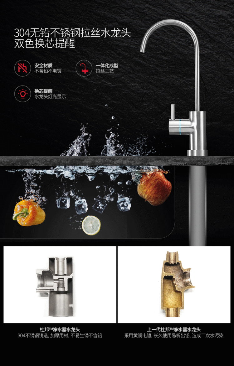 除了过滤系统,还配备了智能取水终端,即电热水壶。按下取水键,自动将超滤+RO反渗过滤后的净水注入热水壶,并且满2L自动停止,非常智能。304不锈钢拉丝工艺水龙头,配有显示灯,蓝灯表示滤芯性能良好,橙色表明该换滤芯了,一目了然。