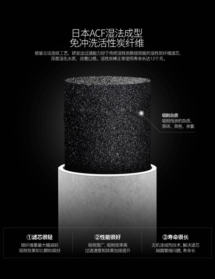 四级过滤:后置日本ACF湿法成型免冲洗活性炭纤维,寿命18个月。