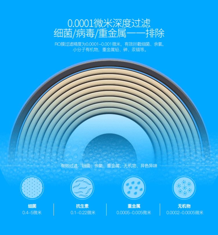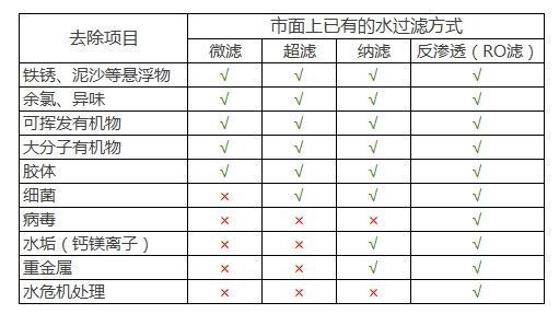 净水器的核心是滤芯,根据滤芯的不同,净水器分为微滤、超滤、纳滤和反渗透,对应自来水里可能含有的以下物质,过滤能力如下表: