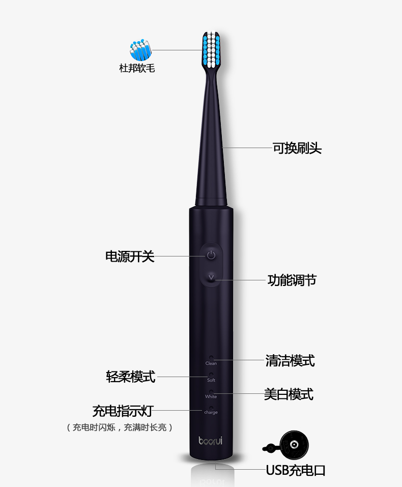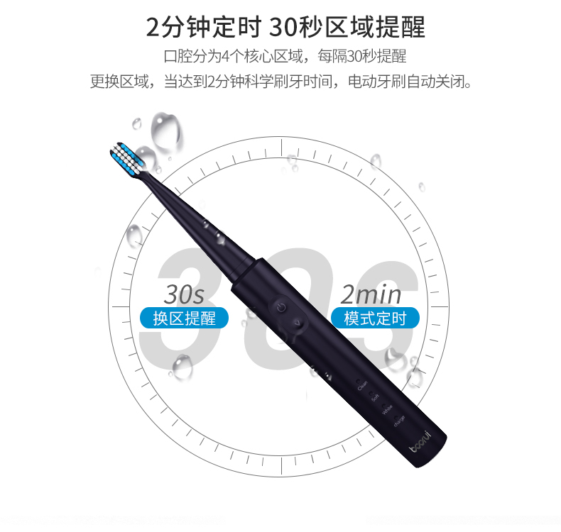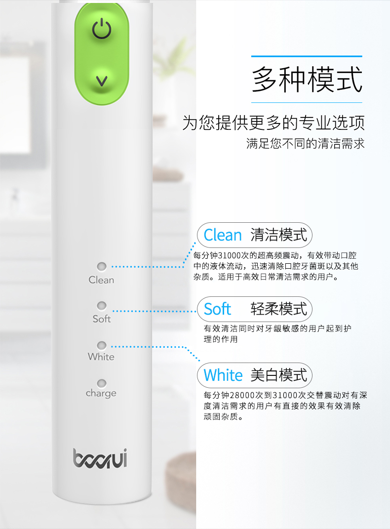3种刷牙模式可选择,自上而下,清洁模式,轻柔模式,美白模式,根据不同的口腔环境,进行选择;可深入清洁牙缝,清洁口腔死角。