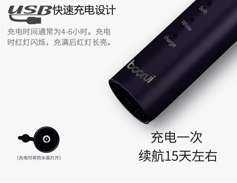 手柄使用人体工程学设计,微磨哑光质感,防滑防脱;有智能定时2分钟提示功能,每30秒停机0.5秒,提醒换位置;内置强劲锂电池,充满电,可连续使用15天;IPX7防水设计,可全身水洗。