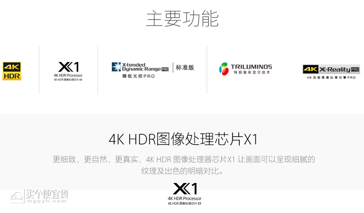索尼在2017年推出的E系列产品,全面升级为了可以更好的适用于4K HDR处理的4K HDR X1芯片,在原有的基础上增加了HDR动态逐像重塑技术、4K HDR 14bit平滑渐变等核心功能,通过对画面对象进行独立精准优化,让细节过渡更为平滑,画面更加趋向真实环境的明暗对比与色彩。X9000E采用的是直下式背光,精锐光控Pro标准版规格。其他规格方面例如特丽魅彩技术,4K迅锐引擎处理新品均有配置,基本延续了索尼一贯的作风。