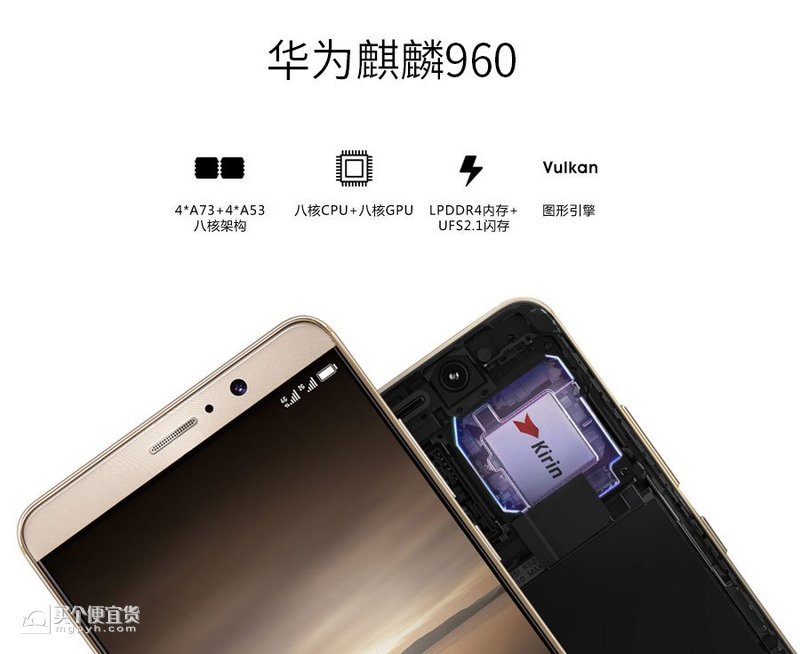 搭载麒麟960处理器,采用16nm工艺,使用Artemis核心,性能较上一代麒麟950有大幅度的提升,并且提供金融级SOC加密功能,更好的保护个人隐私。拥有4000毫安电池,同时华为还为其配备了全新的SuperCharge快充功能,充满手机只需90分钟。