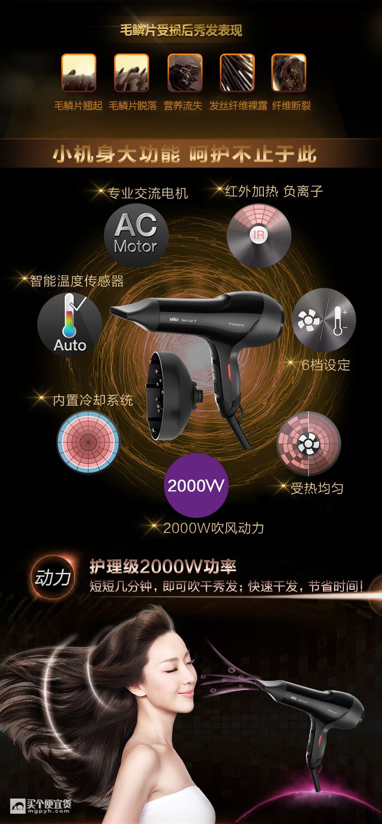 Braun 博朗 电吹风机HD785 DF是Braun主打便携的新款,110~220V全球通用电压在全世界任何地方都可以使用,IONTEC负离子渗透技术,减少静电,呵护头发毛鳞片,打造亮泽健康秀发,特别适合受损发质。虽然体积小巧,但具备2000w的大功率,另外还有3档风力调节,3档温度调节,可快速吹干头发,节约时间。