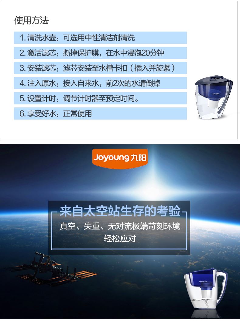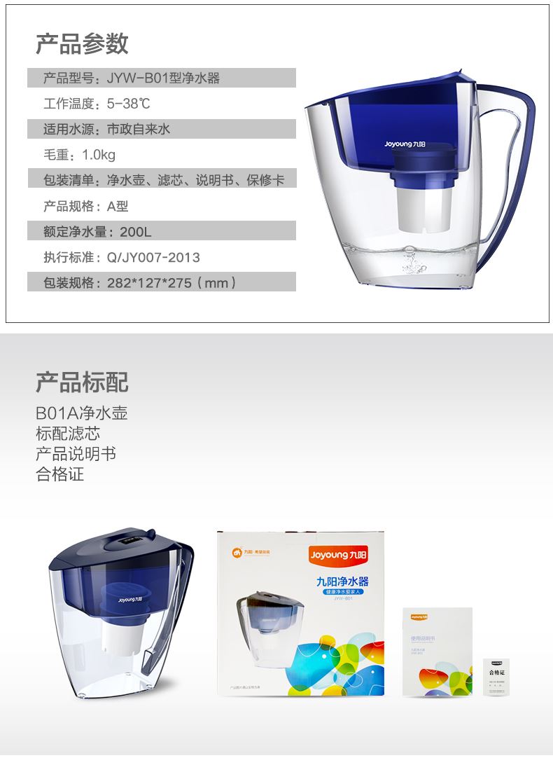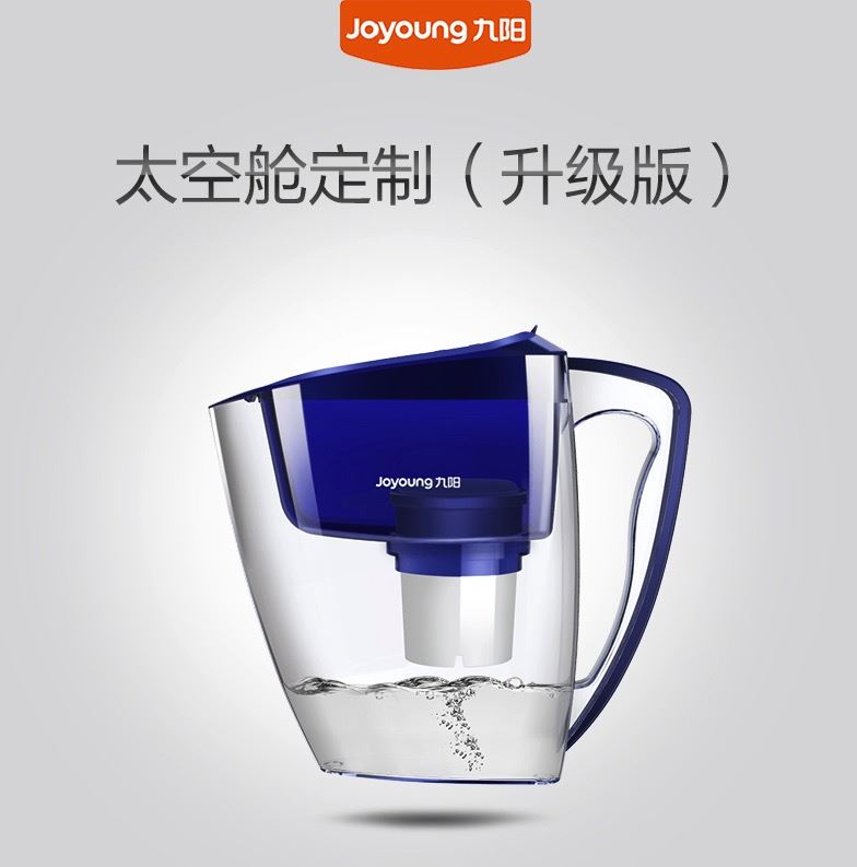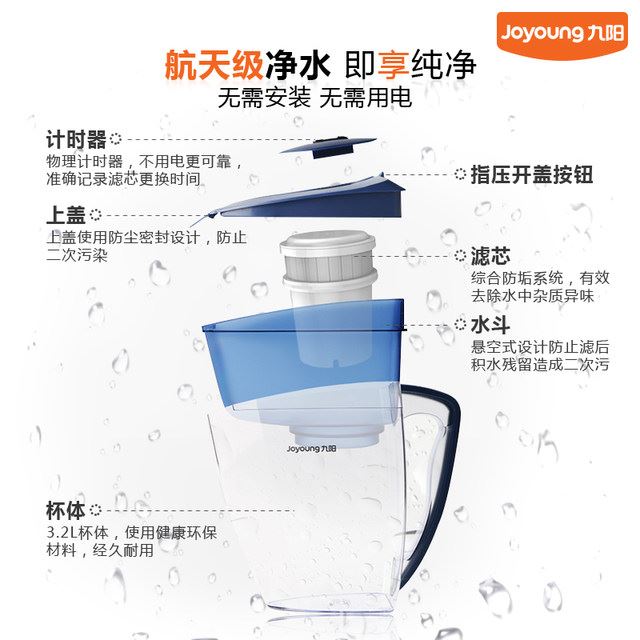 九阳 JYW-B01 家用厨房净水壶,滤芯制水量大约200L,0.5L/min,可使用长达两个月,四层过滤,精密过滤网—离子交换树脂—椰壳活性炭—PP棉过滤层,0.0001mm精度;顶盖有物理计时器,可准确记录滤芯的更换时间;有防尘盖设计,防止二次污染,指压开盖按钮;