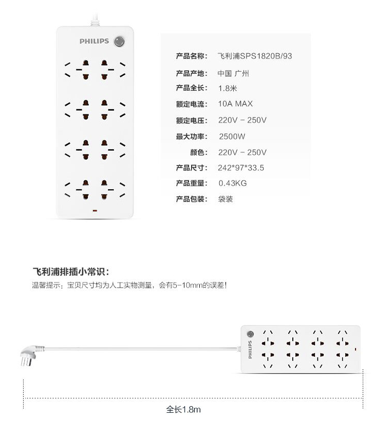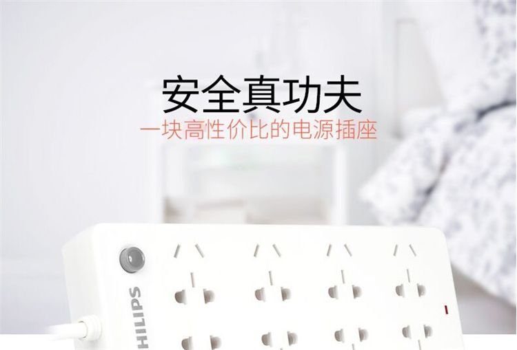 飞利浦 插排 1.8米 8位 包邮 36.9减10元券后 26.9元