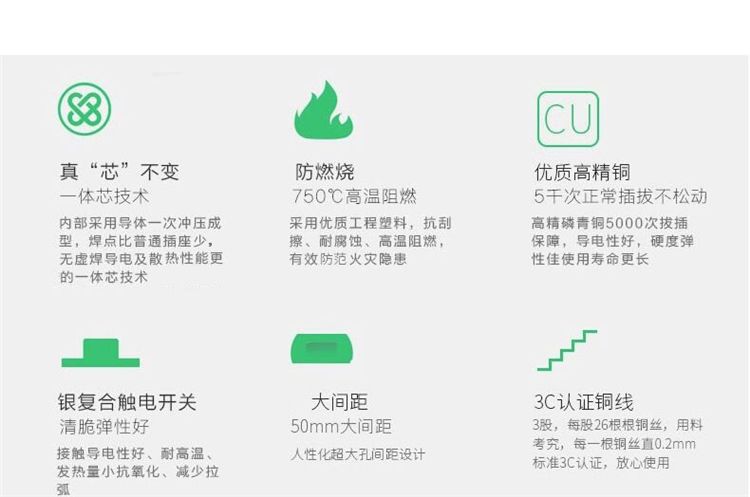 内部导体一次冲压成型,焊点少,电阻低,无虚焊,导电及散热性能更好,更安全更耐用。简洁的一体芯结构降低了电阻,提高了导电效率,因此更加节能环保。一体式外壳整体均采用阻燃胶料,750度高温阻燃,安全可靠。