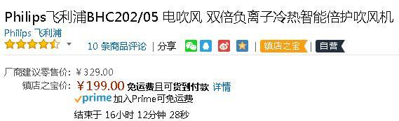 独立的冷风喷出按钮,轻松塑造发型!Philips飞利浦BHC202/05电吹风,原价329元,目前亚马逊镇店之宝特价199元包邮,价格不错,同款京东228元,国美409元。