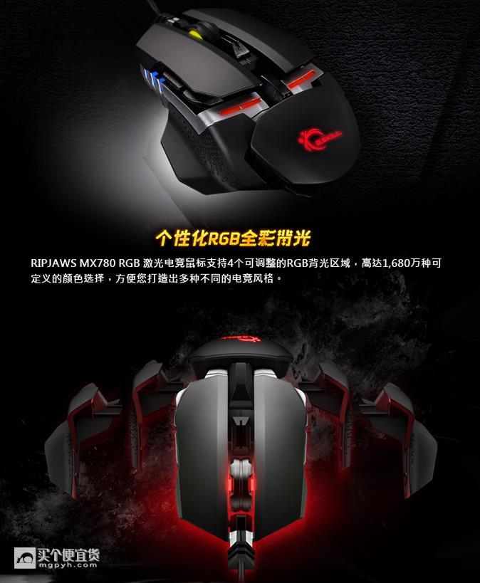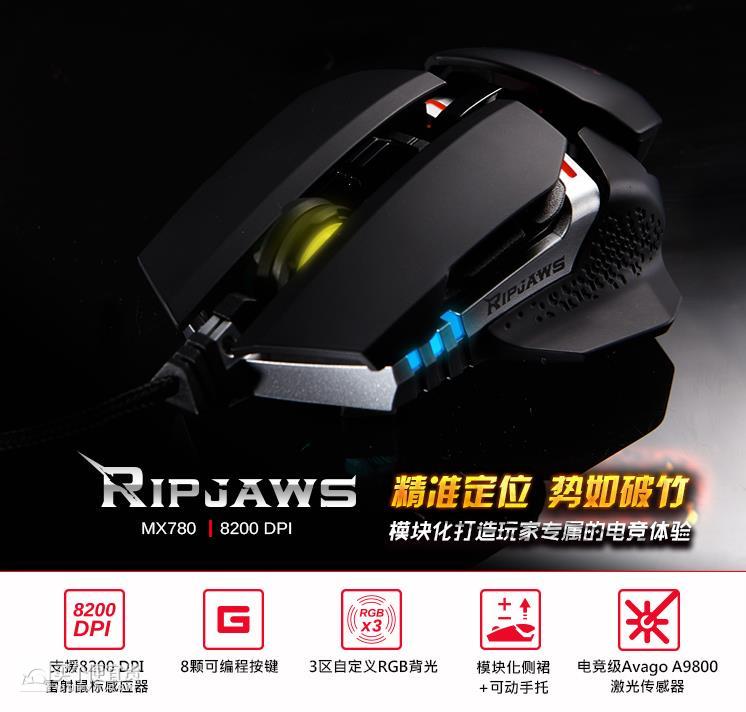 芝奇RIPJAWS MX780使用了Avago(安华高)A9800激光引擎,最高DPI 8200,刷新率1000Hz,对称式设计,左手和右手玩家都可以从容掌握。微动来自欧姆龙,号称有2000万次点击寿命。鼠标上一共具有8个可编程按键,RGB的背光还可以自己定制,板载512KB闪存,能够存储五个键位配置方案和灯光方案。