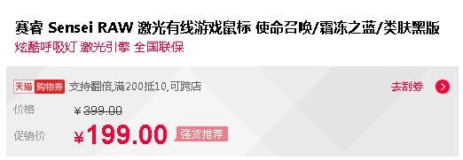 炫酷呼吸灯,激光引擎!赛睿Sensei RAW激光有线游戏鼠标,原价399元,目前天猫特价199元包邮,价格不错,同款京东379元,亚马逊315元。