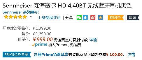出色的音质,适合日常行进中聆听!Sennheiser森海塞尔HD 4.40BT无线蓝牙耳机,原价999元,目前亚马逊Prime会员下单立减100元,实付899元包邮(Prime会员注册免费试享,仅需绑定银行卡或信用卡,非常方便),冰点价,同款京东1299元。