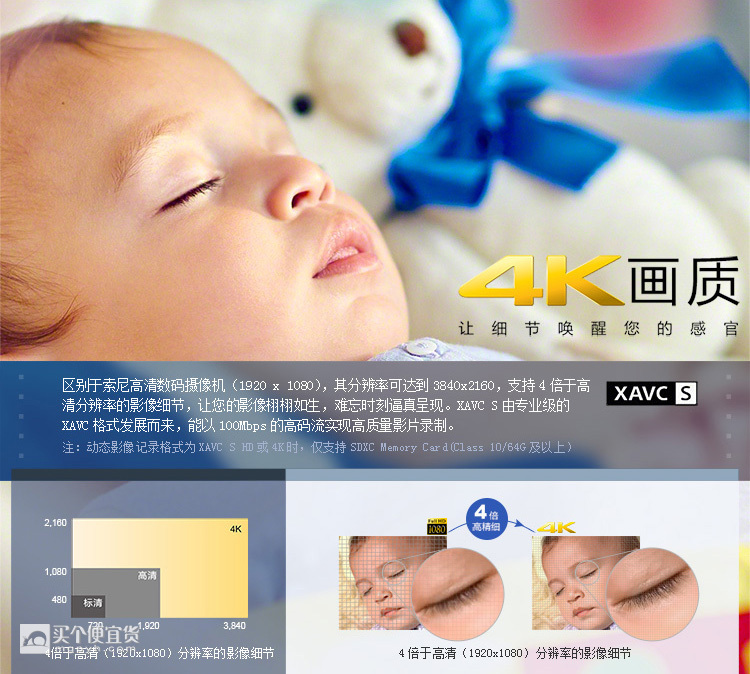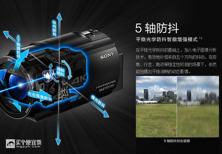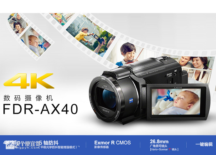 这款SONY 索尼FDR-AX40 数码摄像机具备五轴防抖技术,支持4K视频的摄录。它的定位为普通家用产品,在摄录规格上搭载1/2.5英寸背照式Exmor R CMOS,有效像素为829万像素,最高可支持4K@30fps视频。镜头为4.4~88mm(等效26.8~536mm)F2.0-3.8蔡司Vario-Sonnar T镜头,拥有20倍光学变焦,和250倍数码变焦。另外它拥有3英寸46万像素可触摸液晶屏。