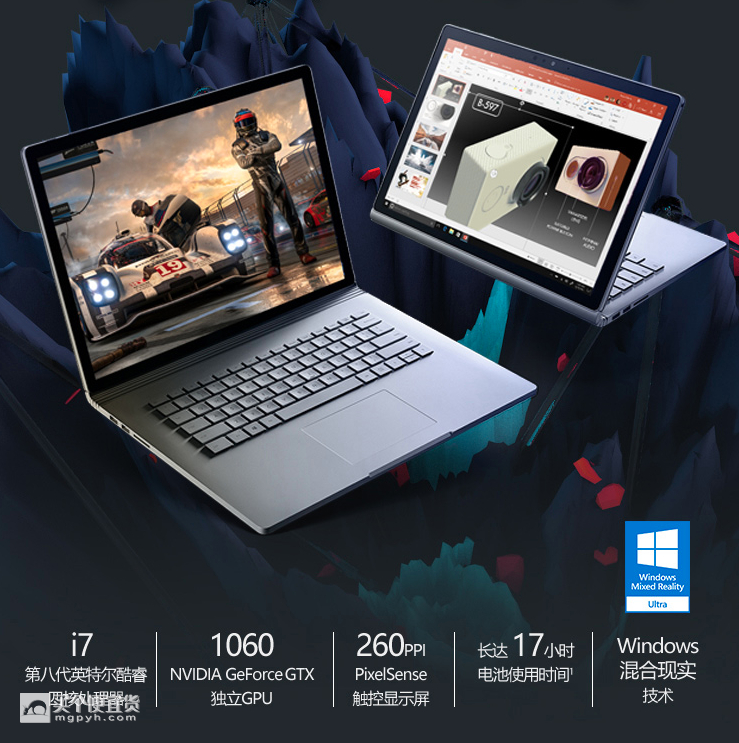 Microsoft微软Surface Book 2笔记本电脑包括13.5英寸和15英寸两个版本,外观部分改变不大,只在小细节上有所调整。15英寸版本搭载i7-8650U处理器,16GB DDR4内存,除了HD620核显外,还有更强大的GTX 1060 6GB独显,搭载3:2长宽比3240x2160分辨率屏幕(260ppi像素密度),所有版本都提供256GB/512G/1TB SSD储存可选。