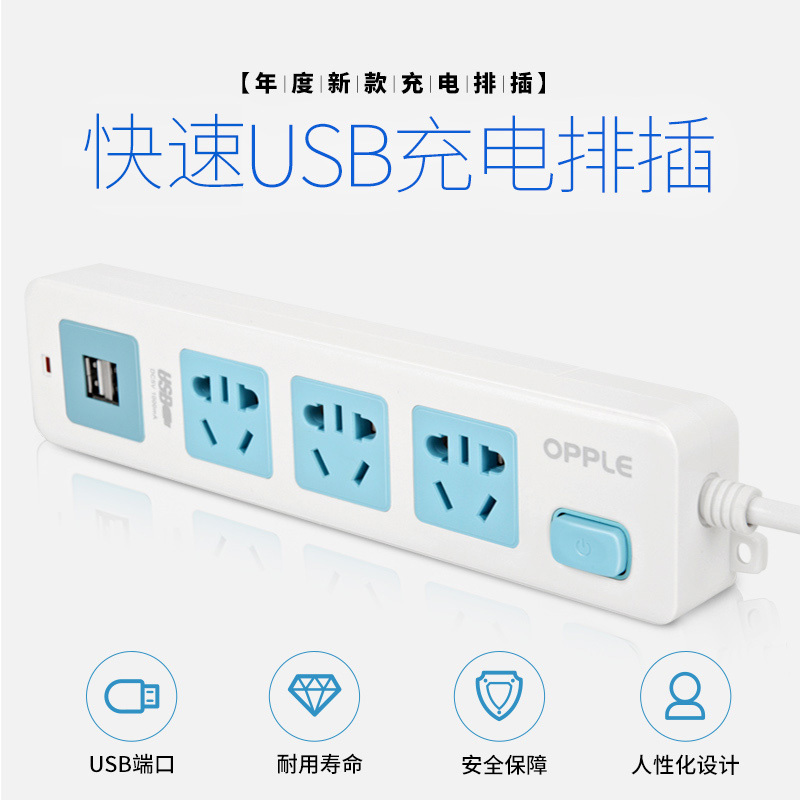 这款欧普的三位五孔插排,带指示灯,没开关,采用阻燃pc材料、铜片和铜芯导线,有儿童保护门,尺寸1534425mm,重量0.25kg,最大功率2500W。