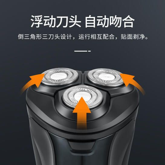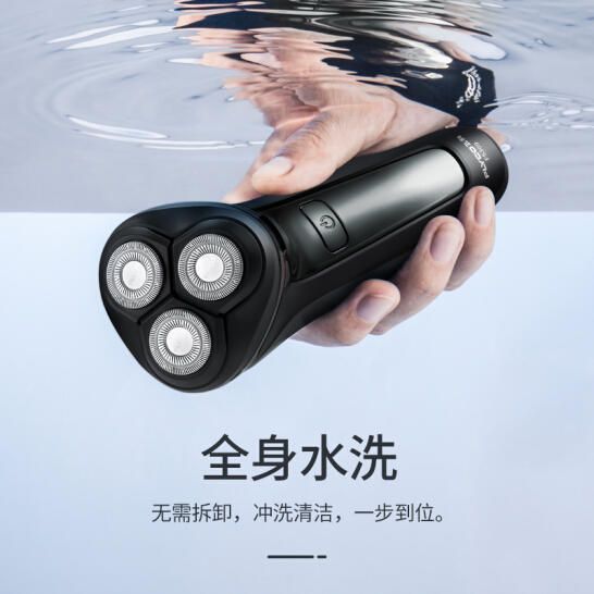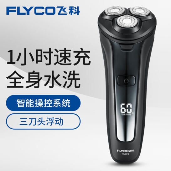 飞科FS309电动剃须刀,倒三角型三刀头设计,运行相互配合,贴合剃净,双环弧形贴面刀网,会刮次数少,光滑流畅,1小时速充,约可使用60分钟,边充边用,无需等待,全身水洗,方便清洁。