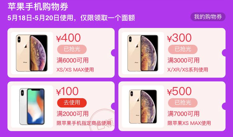 苹果手机购物券→领券地址(手机打开,PC端看不到券),5月18日-20日期间,每天0/10/15/20点可抢。虽说是抢券,但实测2000-100券随时都能领到。