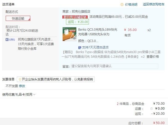 京东商城 Benks 邦克仕 QC3.0快充充电器 18W + 5A快充 数据线 1.2米 2件 50元