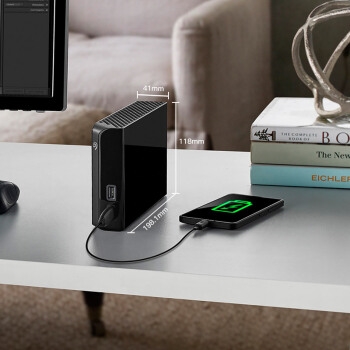 该外置硬盘前端配有两个USB拓展Hub接口,您可以备份文件同时还可以在硬盘通电状态时对平板电脑手机等设备充电。多种用途百变功能,连接其他外界硬盘,支持多显示器扩展。Backup Plus Hub采用垂直防止设计,有效节省桌面空间,全机黑色低调时尚,同时流线弧角与网状设计,大幅提升散热效果和产品耐用性优化产品性能,8TB让你尽享数字生活。