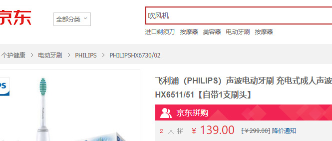 京喜app:PHILIPS 飞利浦 HX6511 电动牙刷 139元包邮(需拼购)