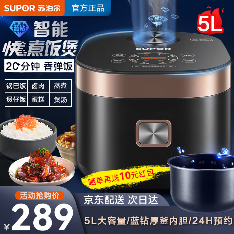 PLUS会员:SUPOR 苏泊尔 SF50FC975 电饭煲 5L 绅士黑 229元包邮(双重优惠,晒单返10元)