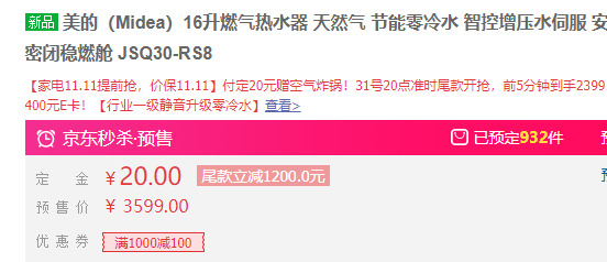 再降价、双11预售、PLUS会员:Midea 美的 JSQ30-RS8 零冷水燃气热水器 16L 天然气 返后1768.9元(2299元+返500元E卡+9.9元购家居卡,晒单返50元后1709元)
