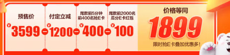京东自营预售,支付定金20元,尾款立减1200元,31号20点付尾款,前5分钟付款返400元E卡,尾款前2000名再返100元E卡,领券100元,叠加PLUS9.9开通499-40元优惠券,种草秀晒单返50元,31日20点付尾款到手相当于1709元,现付定金送空气炸锅,到时若可叠加PLUS超级补贴券,PLUS会员全品券到手更低。
