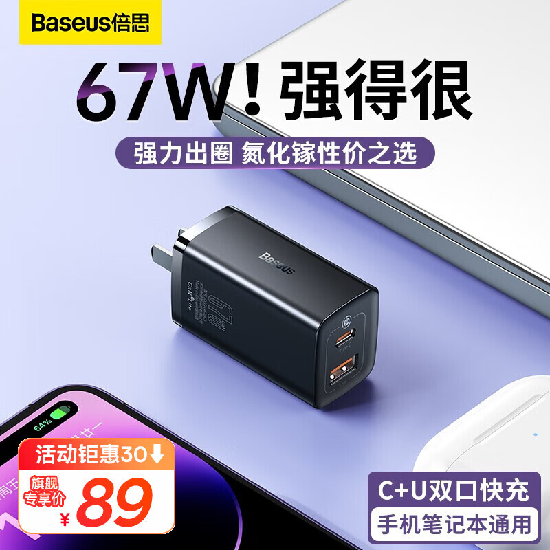 BASEUS 倍思 CCGAN67UC3 65W氮化镓充电器 1C1U 89元包邮(双重优惠)