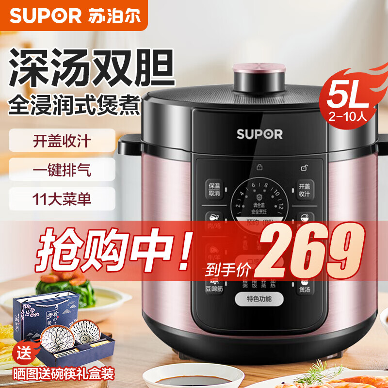 SUPOR 苏泊尔 电压力锅大容量5L升双胆高压锅家用电饭锅煮饭煲汤不粘锅智能预约深 239元(需用券)