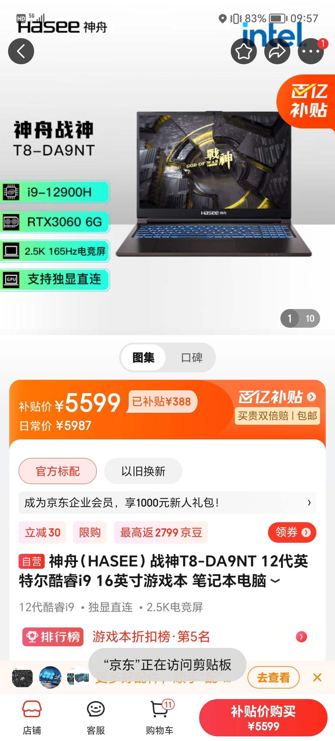 百亿补贴 神舟(HASEE)战神T8-DA9NT 12代英特尔酷睿i9 16英寸游戏本 笔记本电 5599元